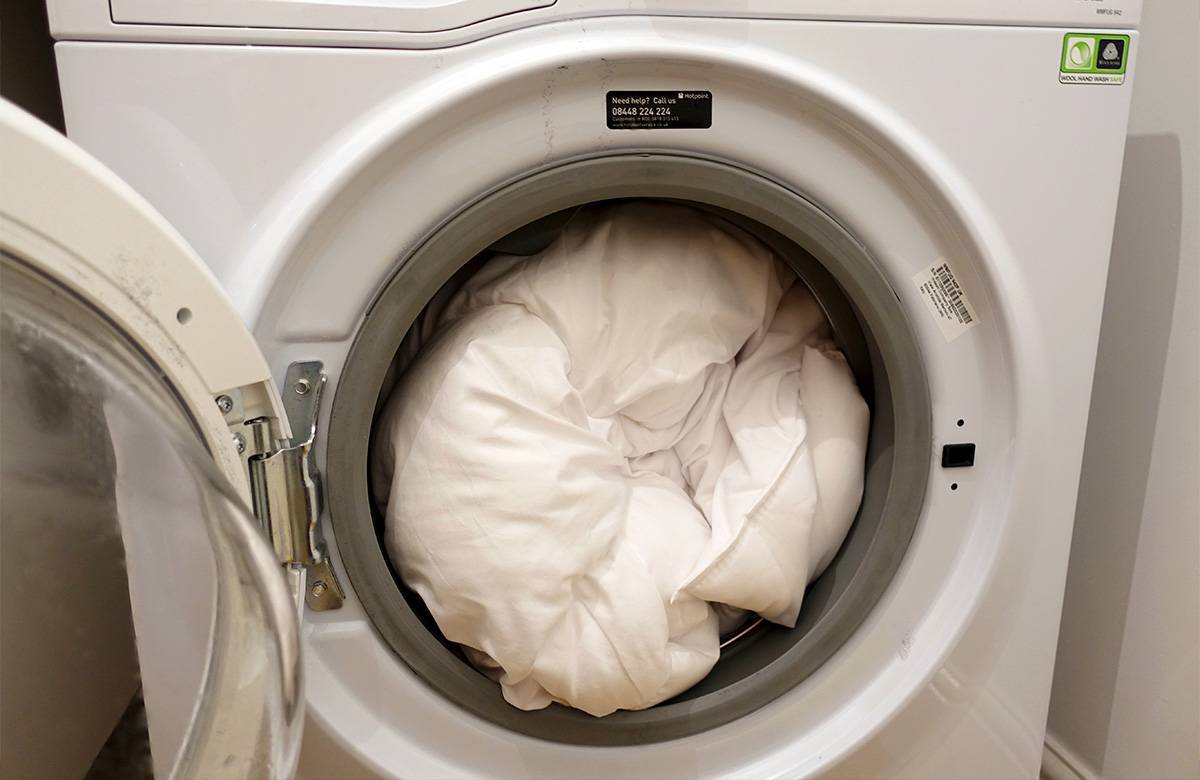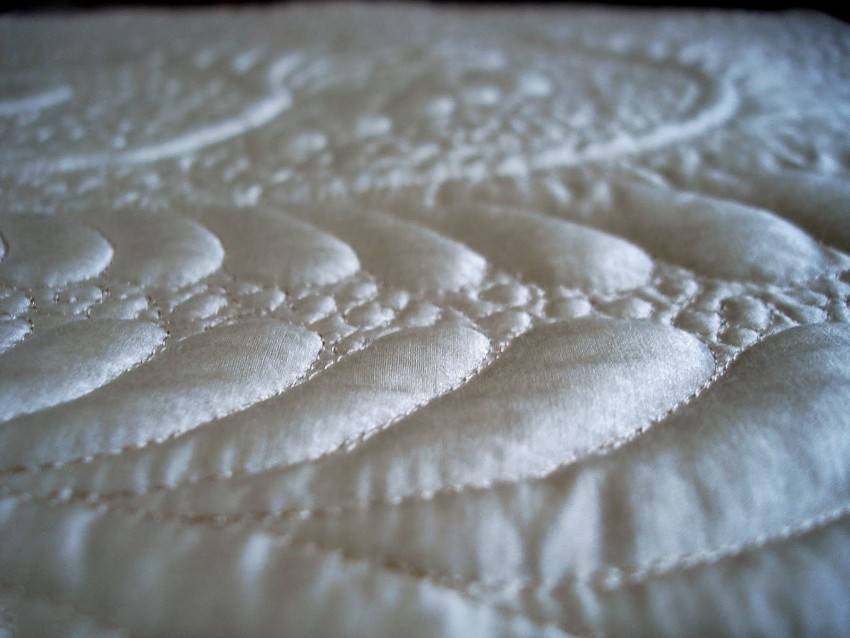 11. Перевертываем одеяло на лицевую сторону, руками разровняйте утеплитель в местах швов. Заштопайте «окно» потайными стежками вручную или на машинке на расстояние 2-3 мм от края.