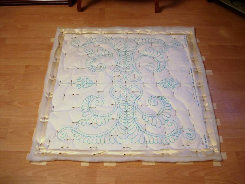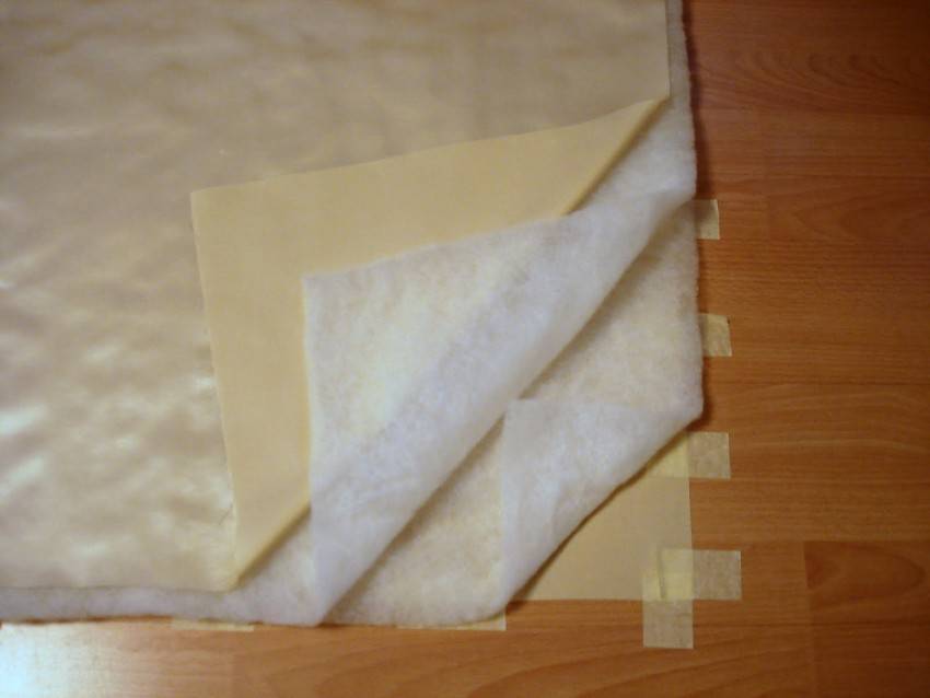 5. Разложите утеплитель на рабочей поверхности, сверху положите хлопок наружной областью вверх. Сколите утеплитель и х/б ткань с помощью портновских булавок по всему периметру.