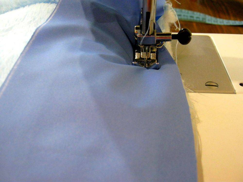 4. С помощью английской булавки вдеваем резинку, делаем сборку и закрепляем концы резинки машинной строчкой, пряча незашитые срезы отверстий внутрь