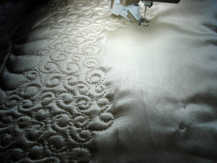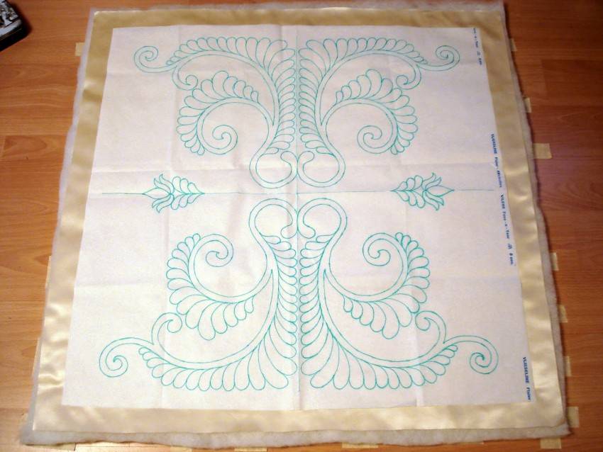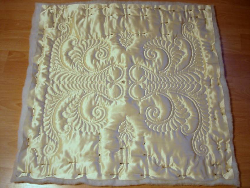 6. Когда слои материй будет надежно зафиксированы между собой, проведите строчки по квадратикам, которые мы проутюжили. Уберите булавки.