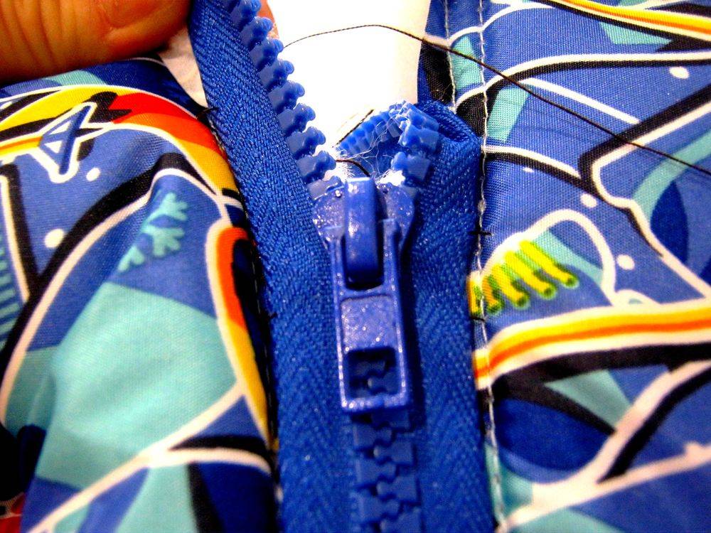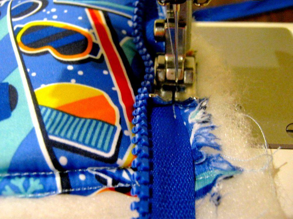 8. Вывернув конверт на изнанку, приметываем разъемную молнию, располагая нижние срезы молний у низа конверта, притачиваем молнию по наметанным стежкам одной строчкой к подкладке и основной детали конверта