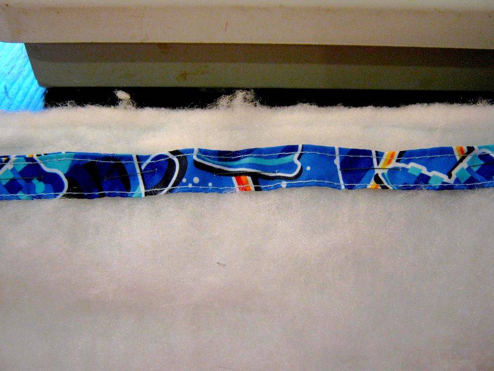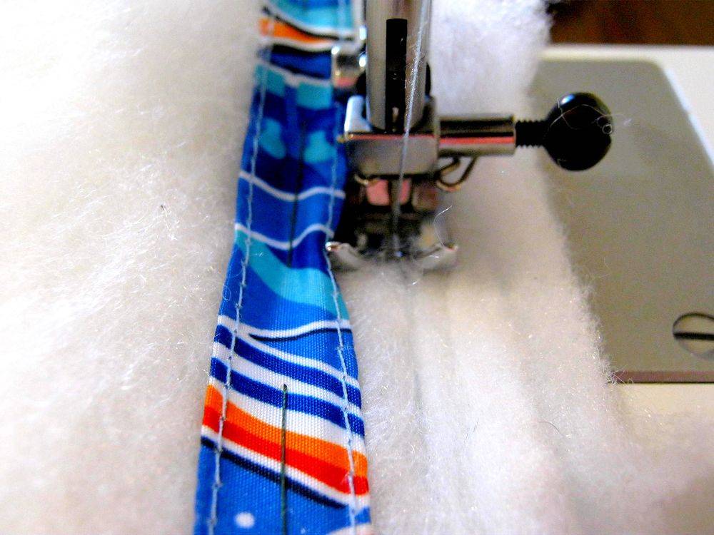 Кладём на синтепон кусочки ткани. Прошить на машинке швом «зигзаг». Это делается для того, чтобы не свалялся при стирке синтепон.