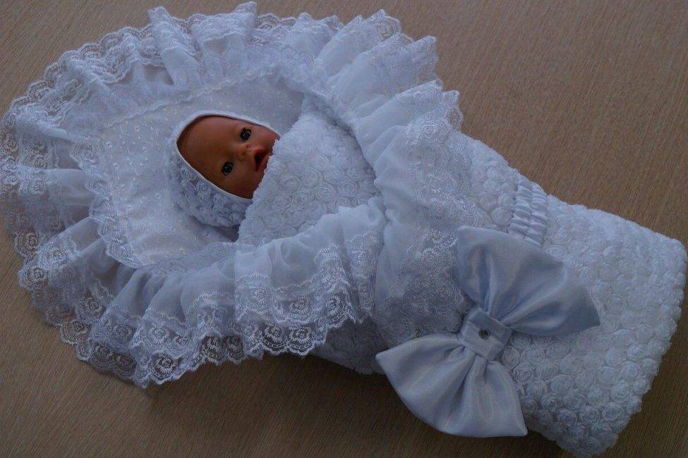 Для торжественных мероприятий, которые отличаются от обычных наличием разнообразных декоративных элементов: рюшей, оборок или бантов. С внешней стороны конверта, чаще всего, используются атлас, шелк или сатин. Для защиты нежной кожи младенца от внешних раздражителей окружающей среды предназначен уголок из вуали, которым прикрывают лицо малыша.