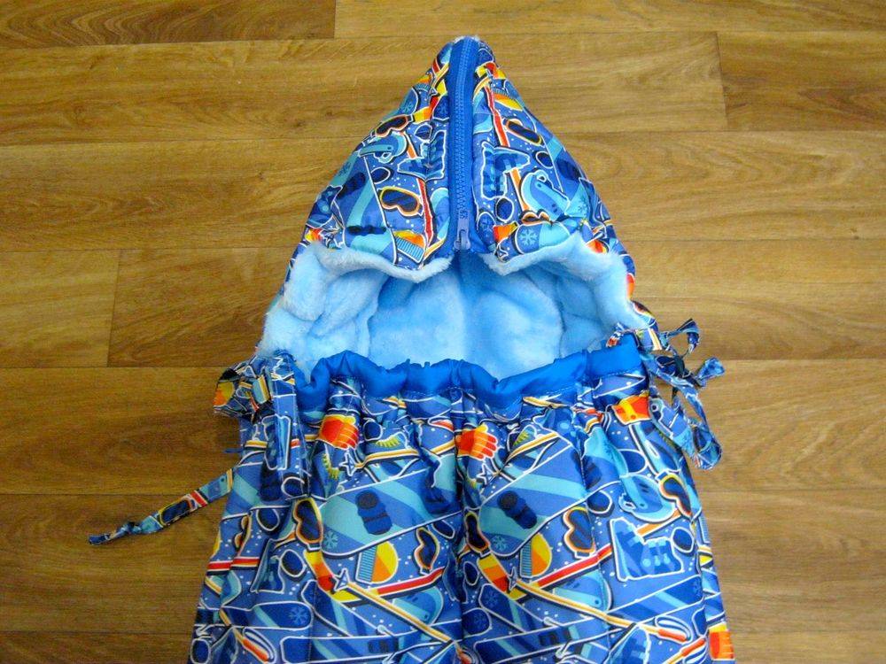 Полученное изделие должно выглядеть, в застегнутом виде, как трубка. Единственный минус такого конверта в том, что голова ребенка будет немного открыта, так как верхние края просто подгибаются. Для того чтобы создать своеобразный капюшон, верхнюю часть следует присборить вокруг головки малыша.
