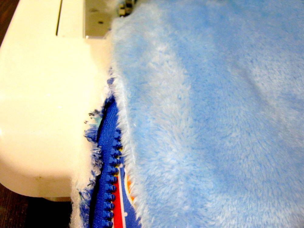 Если вшить молнию из четвертого варианта застежкой кверху, то можно сделать конверт с молнией посередине. Вывернуть ткань, расположить молнию по центру и, ориентируясь на нее, сделать полукруглый вырез для лица. Прошить низ конверта, вывернув ткань мехом внутрь. Обработать все края на 2 см и вставить шнурок для формирования капюшона.