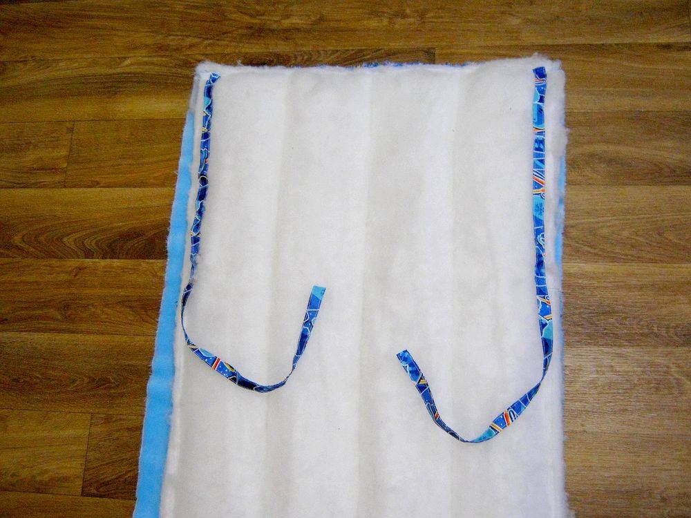5. Накладываем слой утеплителя на изнаночную сторону слоя внутренней ткани конверта и соединяем эти два слоя, простегивая вертикальными строчками через одинаковое расстояние