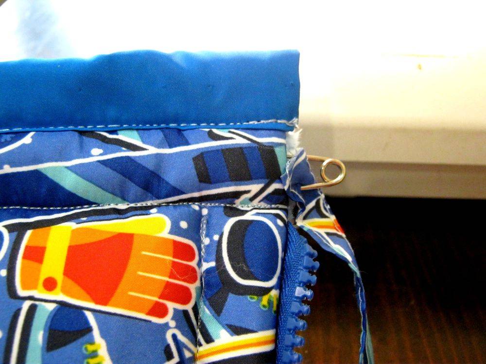 10. Выворачиваем конверт на изнаночную сторону и прошиваем верхний срез вместе с молнией, оставив незашитым небольшой отрезок в 15-20 см для выворачивания