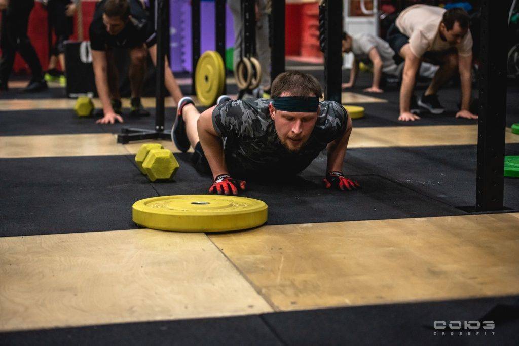 отжимания – 15 повторов в круге. В кроссфите отжимания отличаются от обычных тем, что в нижней точке нужно касаться пола, причем на секунду лечь на него полностью, а руки и ноги оторвать от поверхности;