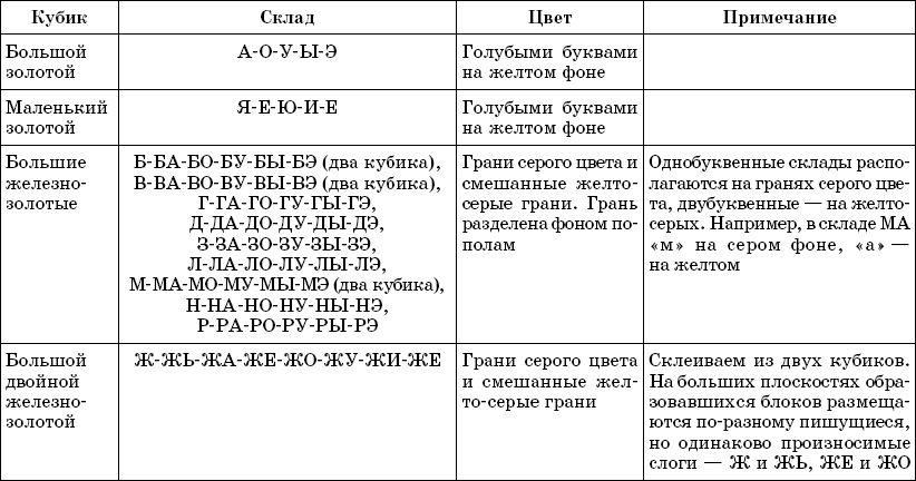 Знакомство начинающих учиться читать поначалу происходит только с кубиками, позже они знакомятся с таблицами.