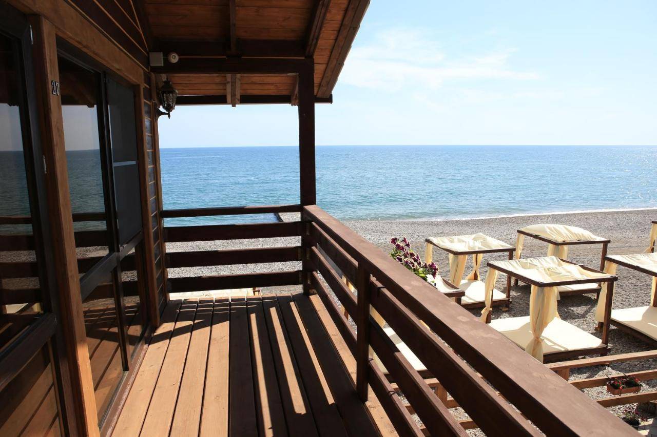 Едем дальше, где поменьше туристов, и находим идеальный по соотношению цены и качества гостевой дом «Аламыс» (см. фото, отзывы и цены) удачно расположен на курорте Гудаута, у самого Черного моря. На пляже удобные лежаки и рядом нет других туристов. Чистейшее море, вкусная еда. На море можно любоваться круглосуточно с балкона номера – ничего подобного на первой линии у моря в Сочи или Лазаревском найти не получится.