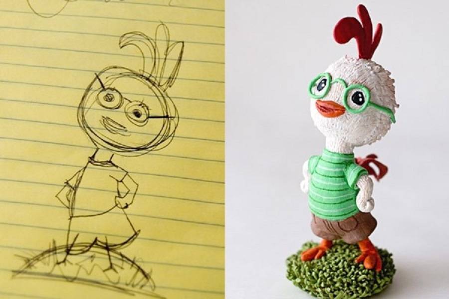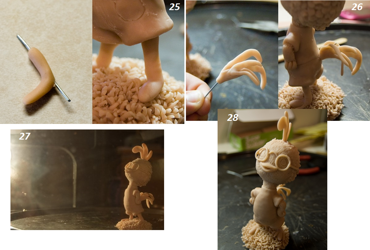 Сформируйте из глины ноги, так же как вы делали руки. Вставьте в них проволоку и соедините тело с основанием. Сделайте хвост и с помощью проволоки закрепите его на фигурке. Добавьте к ногам пальцы а на лицо очки. Можно отправлять цыпленка в духовку. Обжигайте свою фигурку по инструкции на коробке.