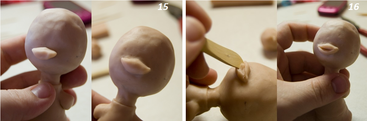 Теперь будем лепить клюв и заканчивать руки.