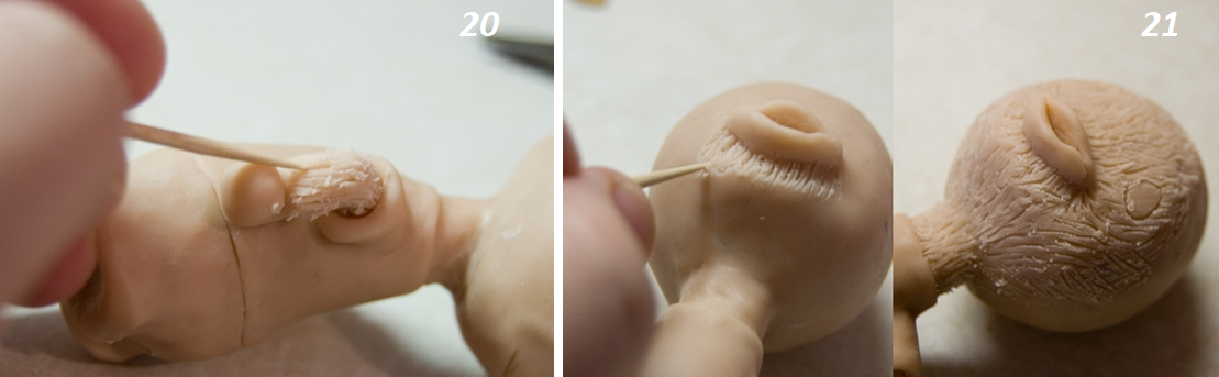 Приступаем к детализации, а именно к прорисовыванию перьев. Возьмите зубочистку или тонкую иглу. Начните с рук. Просто делайте небольшие штрихи, так вы создадите текстуру перьев. Также мы поступаем с лицом. На затылке мы будем делать объемные перья. Но сначала сделайте гребешок как на фото и с помощью проволоки прикрепите к голове.