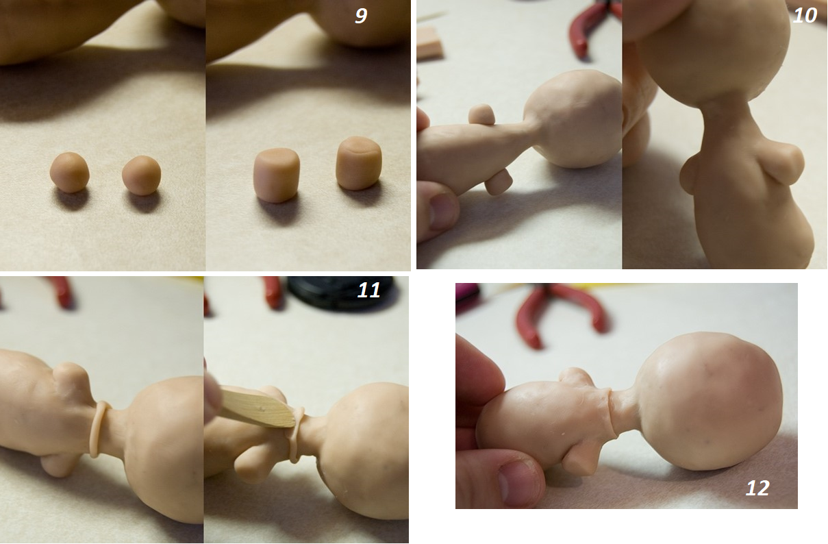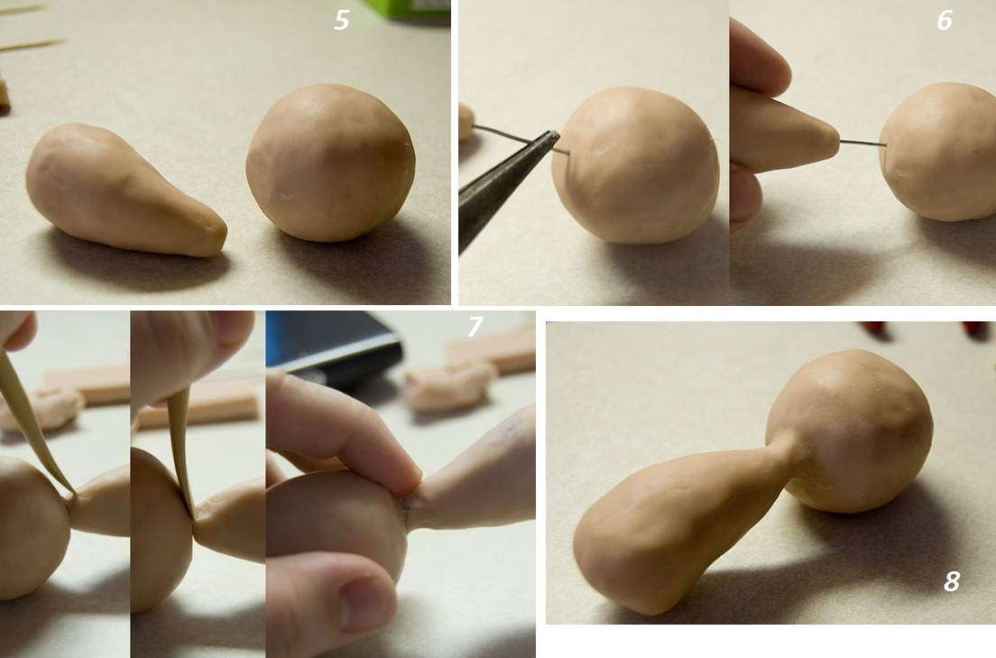 Тело и голову создаем также как и основание. Затем при помощи проволоки соединяем их в одно целое. Переход от головы к телу должен быть плавным. Растяните от тела к голове глину и соедините. У вас должен получиться результат как на фото номер восемь.