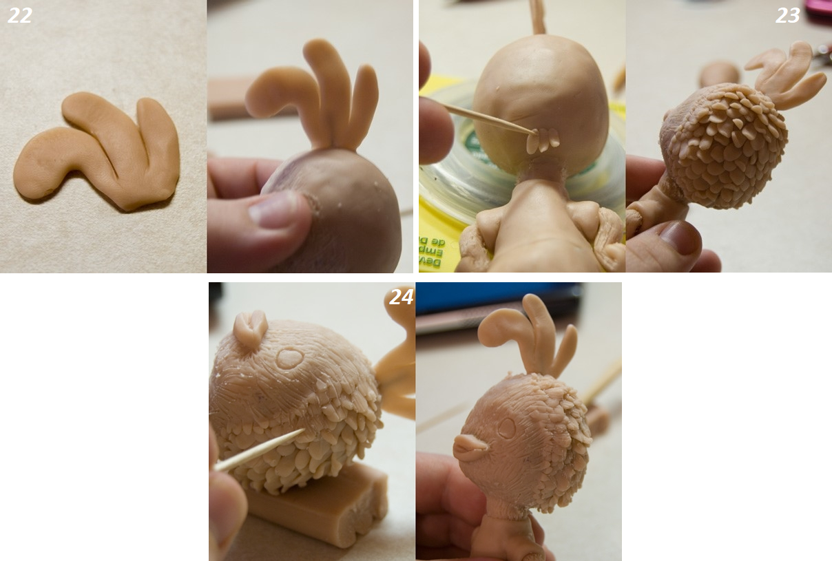 Чтобы сформировать объемные перья, отщипните от глины маленький кусочек, сделайте из него шарик и сплюсните. Затем зубочисткой прикрепите к голове. Начинайте снизу от шеи. Чем ближе к лицу, тем меньше должны быть перья.