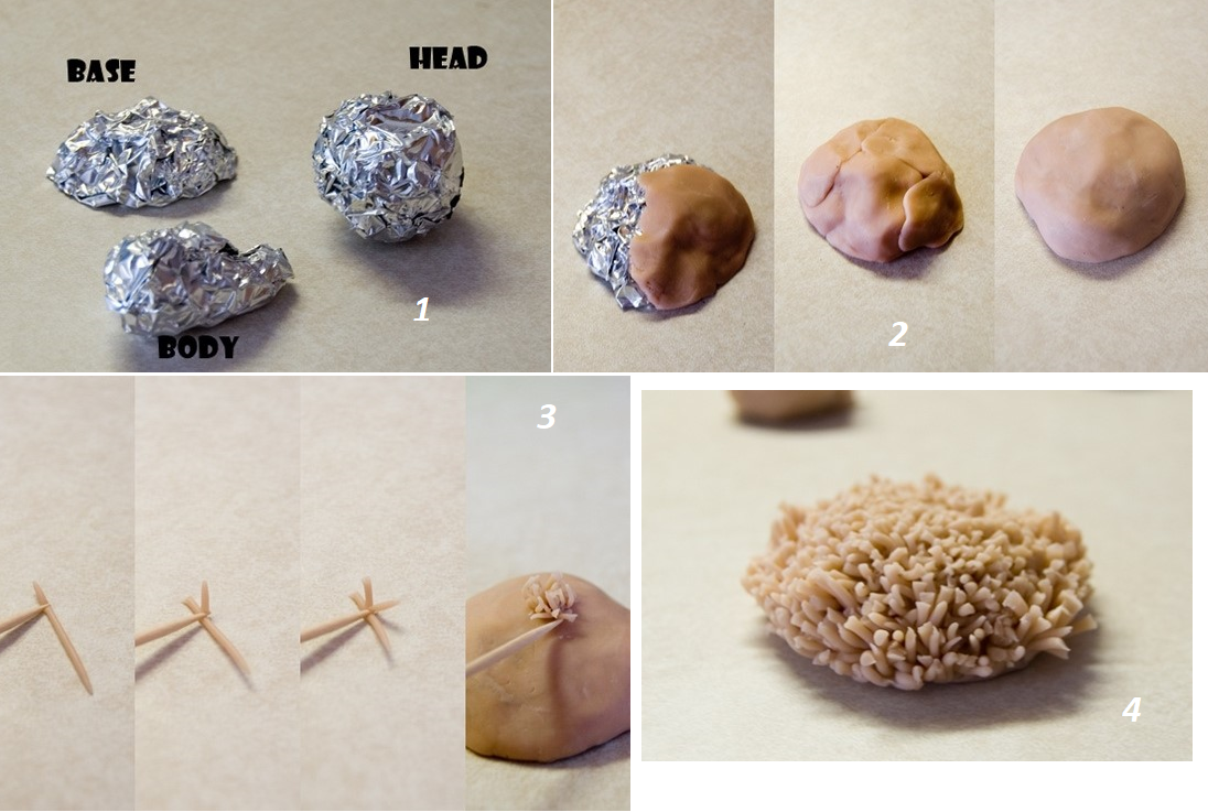 Для того, чтобы не расходовать слишком много глины, объемные части тела мы сделаем из фольги и облепим глиной. Сформируйте три элемента: голову, основание и тело. Начнем создавать основание фигурки.
