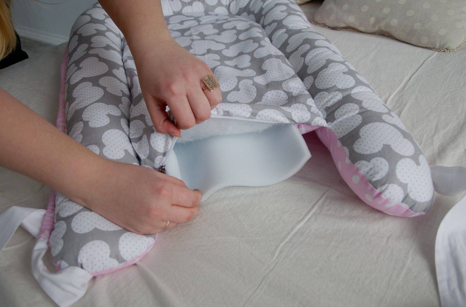 - Крепить валик к матрасу можно несколькими способами: пришить стационарно, пристрочить по периметру тапицерки ленты и привязать валик, либо, как в случае со съемными пеленками — при помощи ленты Velcro (липучки).