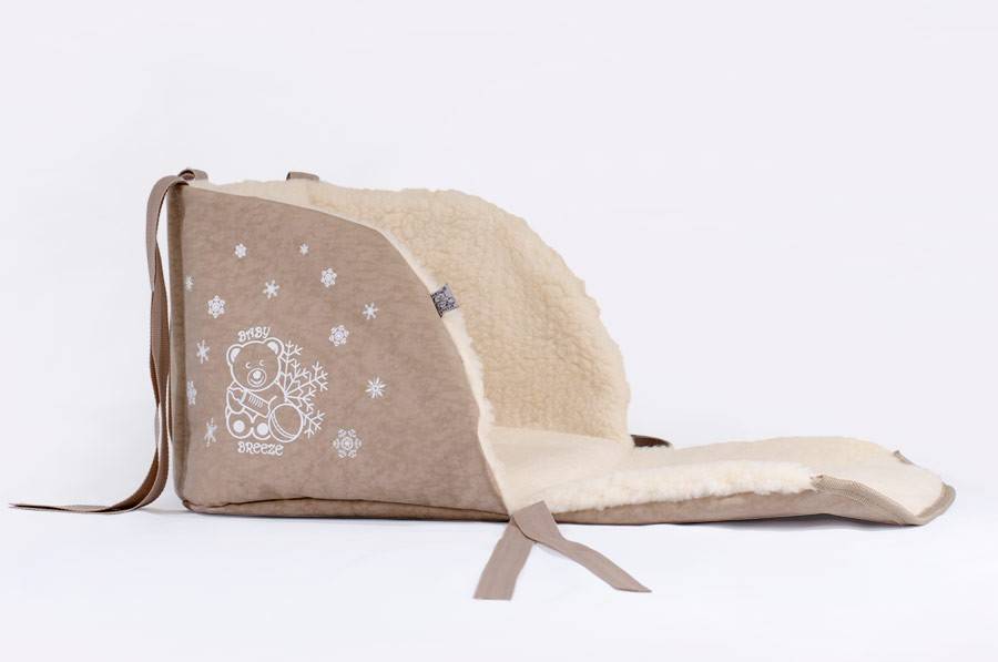 Такие изделия могут быть открытыми и закрытыми. Открытые варианты имеют тканевую основу, зачастую из водоотталкивающего материала, и шерстяную часть, на которую и садится ребёнок. В этом случае крепление осуществляется с помощью завязок или липучек, которые надёжно фиксируются к санкам. Закрытые конструкции представляют собой ткань, чаще водоотталкивающую, и слой меха, на котором сидит малыш и которым закрываются его ножки и большая часть туловища.