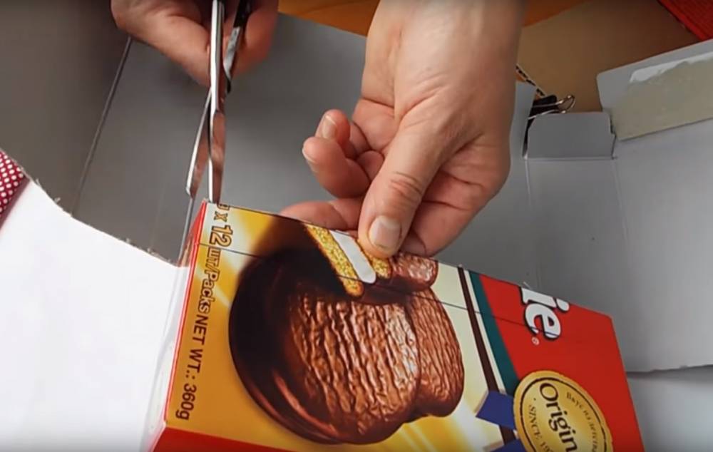 При помощи канцелярского ножа разрежьте одну из длинных сторон коробки напополам, чтобы образовались дверцы шкафчика. Для изготовления полок понадобятся прямоугольники из картона, вырезанные точно по размеру коробки, их необходимо зафиксировать клеем.
