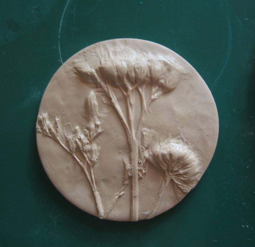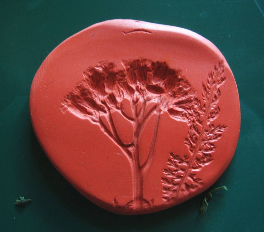 Когда негативы «пропеклись» и остыли, смачиваем их водой с той стороны, где отпечатались прожилки. Кладем их на второй раскатанный кусочек глины. Повторяем операцию с прижиманием пальцами и скалкой.