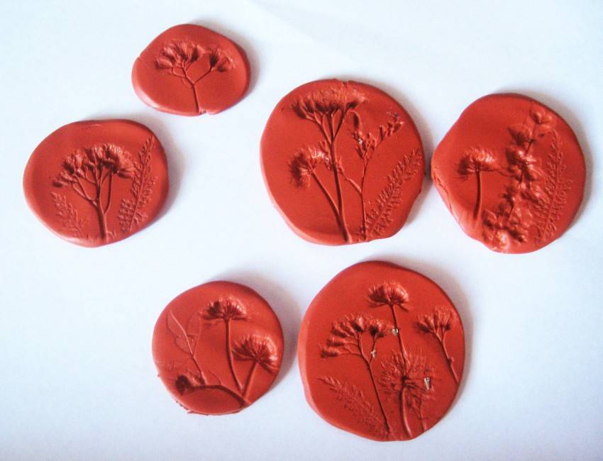 - Полученную массу раскатайте. В готовый пласт вдавите предметы для оттисков и оставьте так минимум на три часа. Лучше всего часов на 12.
