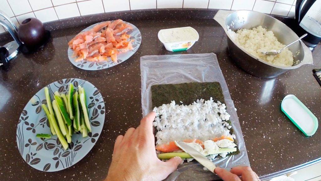 Порцию рисовой крупы (250 грамм) промывают обычной водой до полностью прозрачного состояния жидкости. Затем его откидывают на дуршлаг, чтобы устранить лишнюю влагу. Добавляют в два раза больше воды (500 мл) и отваривают в мультиварке (режим Рис или варка ) или на открытом огне. В уже готовый продукт добавляют сахар, соль и уксус (примерно 50 грамм). Для красивой и аккуратной формы роллов используют специальный коврик. Его раскладывают на столе, предварительно обернув пищевой пленкой с обеих сторон. Сверху укладывают половину листа нори так, чтобы глянцевая поверхность была направлена на коврик. Перед готовкой нужно сделать специальный раствор воды с уксусом и лимонным соком, чтобы смачивать руки при приготовлении. Влажными руками отделить порцию риса, плотным слоем выложить поверх нори. Следующим слоем добавить овощи и морепродукты по вкусу. Медленными аккуратными движениями скрутить ролл, а затем порезать на порционные кусочки. Для красоты можно добавить кунжутное семя в качестве обсыпки готового ролла.