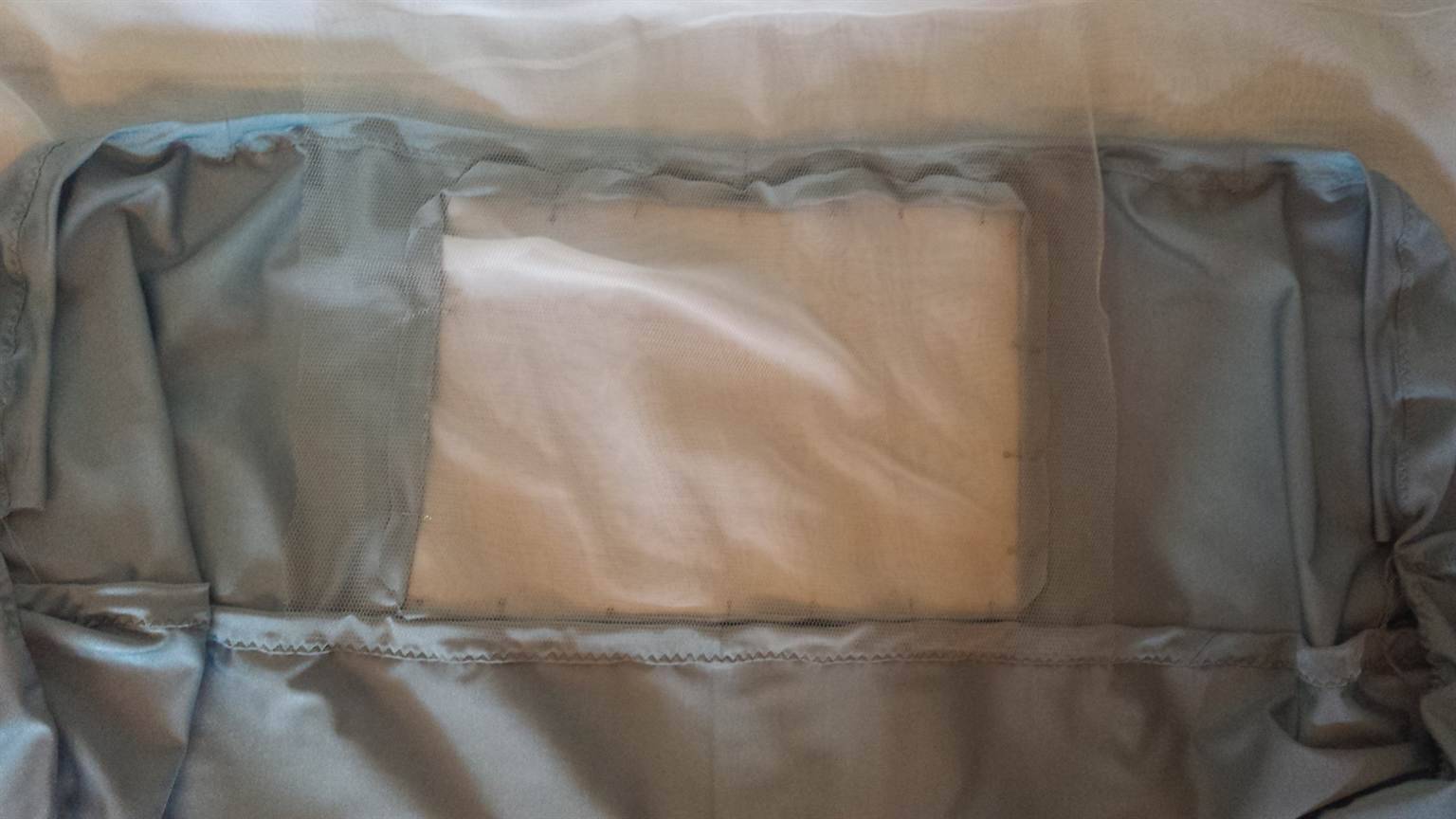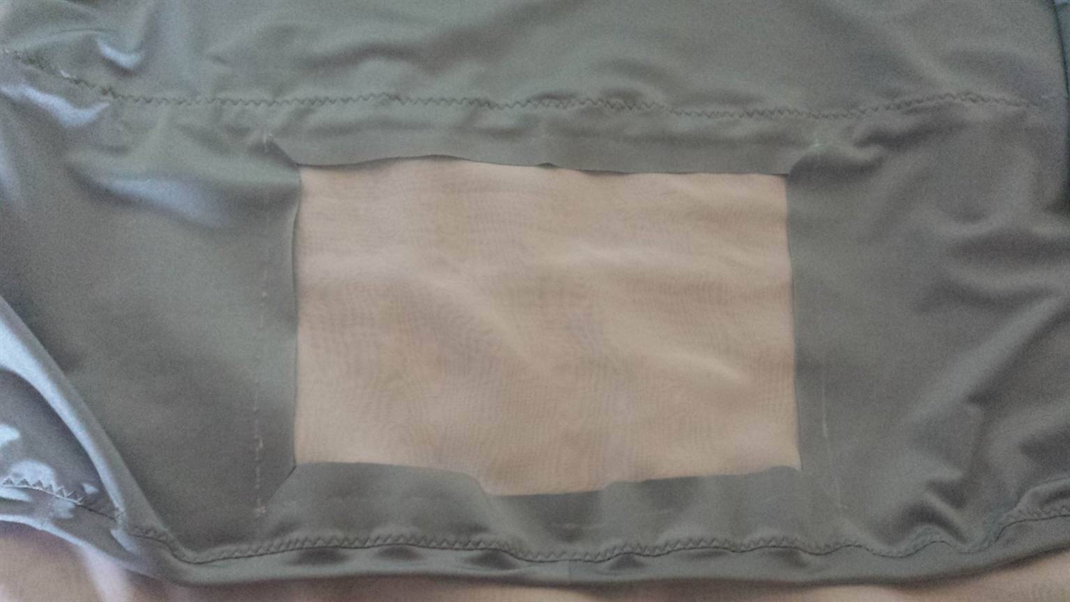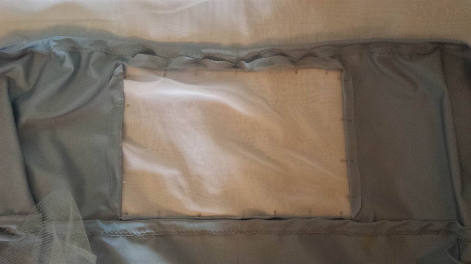 Приступаем к смотровому окошку, для этого в нижней части капюшона вырезаем отверстие размером 30*23, не забываем про припуски.