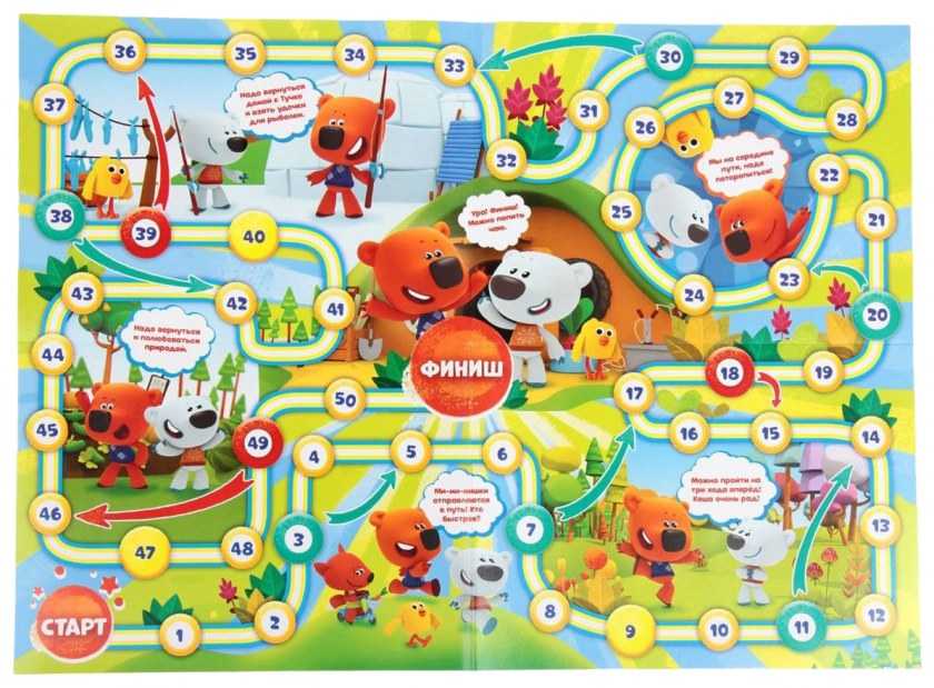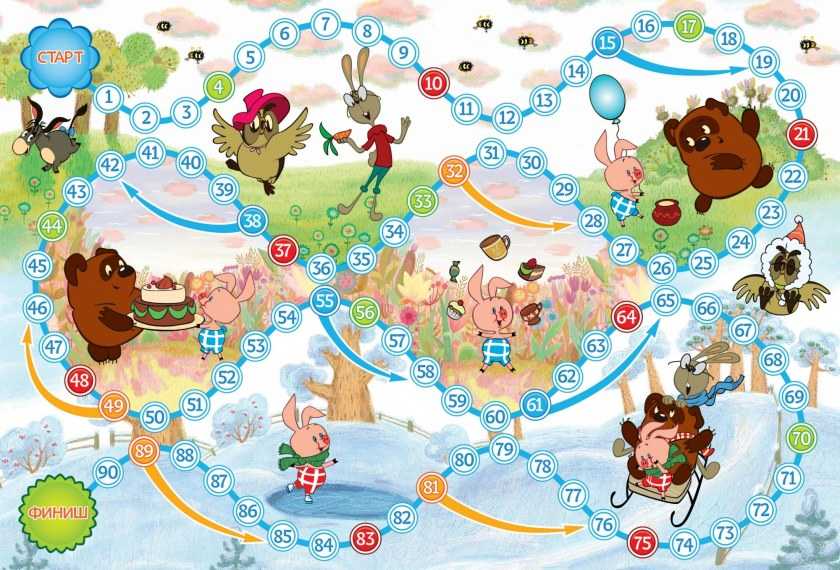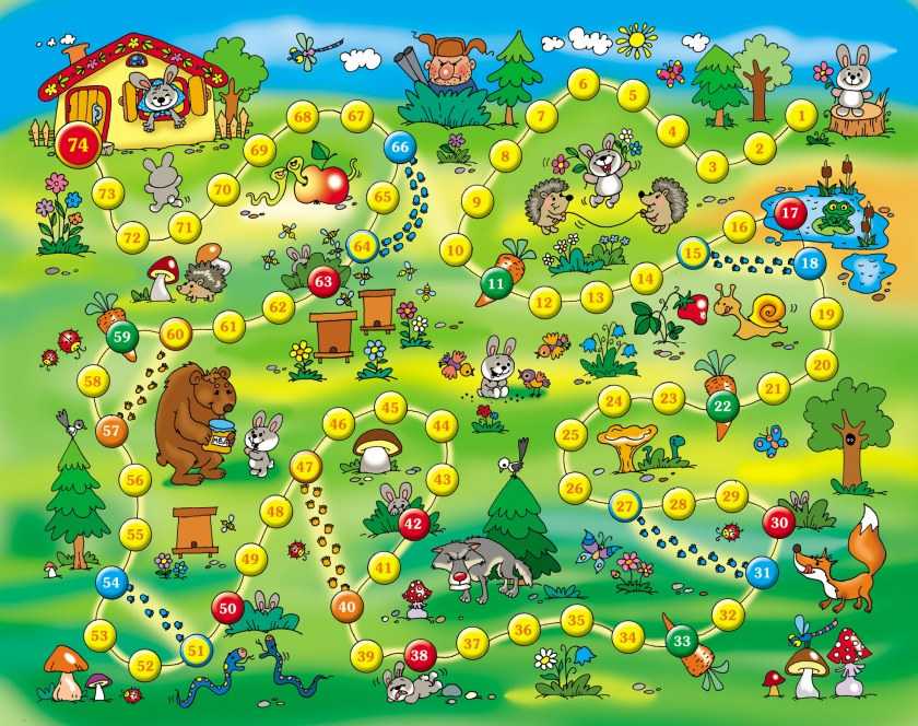 Раскрашенные в разные тона, они позволяют: перепрыгнуть на другой кружок, продвинуться к цели или возвратиться назад. Нередко не дороге ожидает сюрприз – выделенный в другой цвет участок. Находясь на таком «островке», выпадают дополнительные преимущества, нужно спеть песенку или получить поцелуй от мамы и папы.