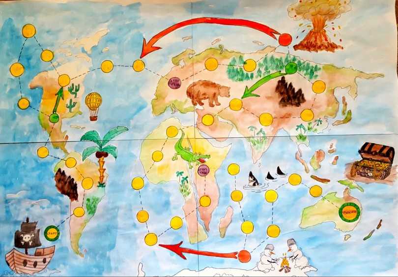 Для поля понадобится картон, все действующие лица наносятся на основу фломастерами или на отдельную бумагу, которую затем необходимо приклеить. Назначение стрелок – придать азарта и создать дух состязания.