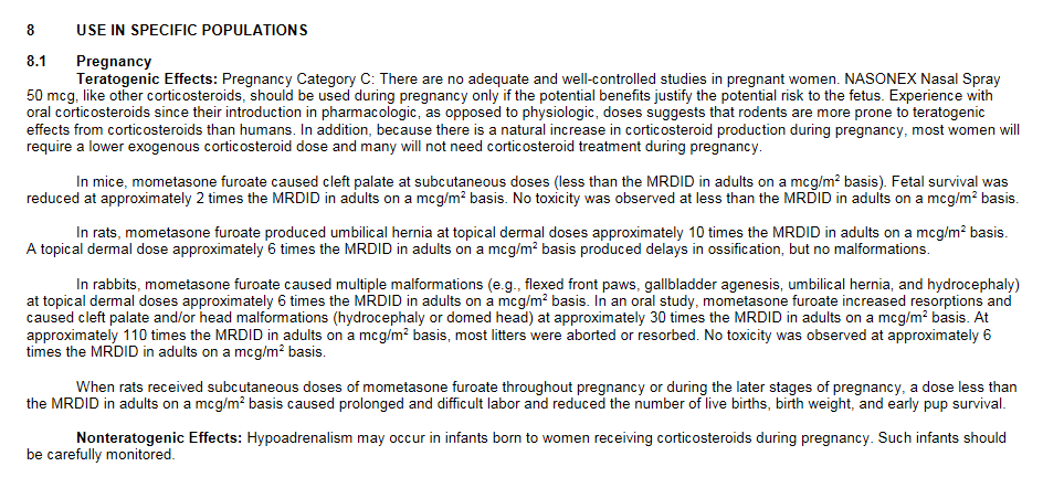 Американская организация FDA относит Назонекс к препаратам категории С – исследования на животных выявили отрицательное воздействие лекарства на плод, а надлежащих исследований у беременных женщин не было, однако потенциальная польза, может оправдывать его использование, несмотря на имеющийся риск.