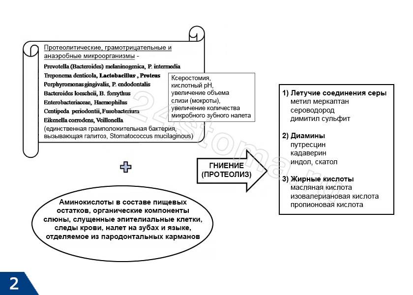 Причина физиологического и патологического орального галитоза кроется в образовании в полости рта летучих соединений серы, диаминов, а также короткоцепочечных жирных кислот. Эти соединения образуются преимущественно благодаря некоторым формам анаэробных и грамотрицательных бактерий, обладающих протеолитическими свойствами (рис.2). Единственная грамположительная бактерия, которая может принимать в этом участие – это Stomatococcus mucilaginous.