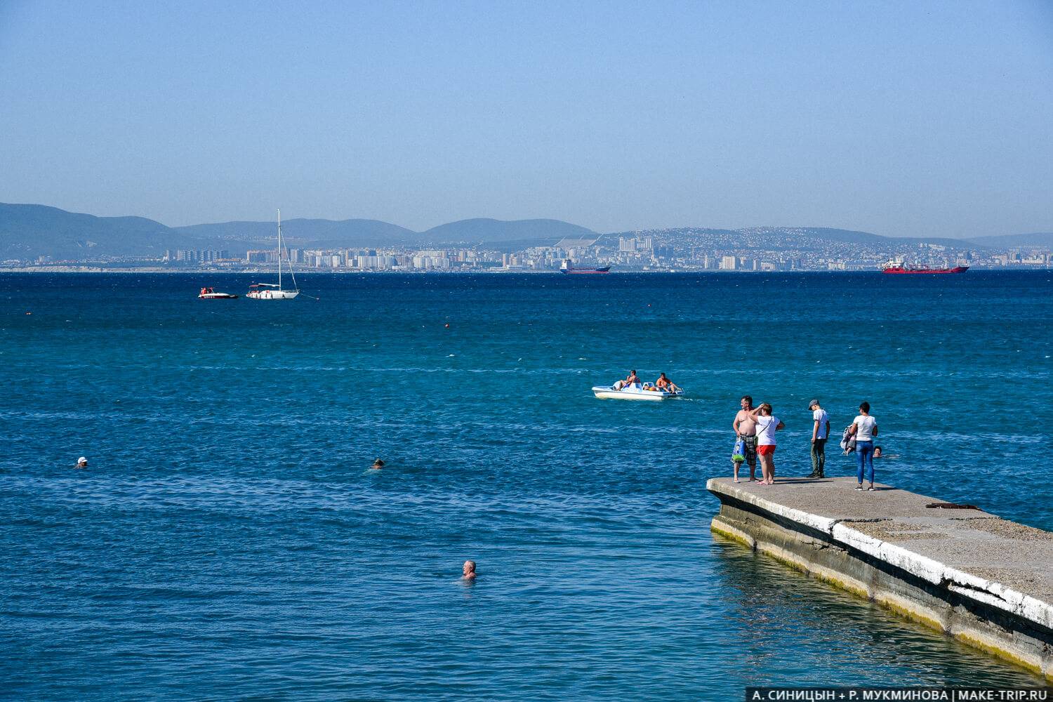 Кабардинка находится в красивой Цемесской бухте, которая сильно напоминает Геленджик. Она глубокого синего цвета и обрамлена зеленью, а на горизонте виднеются силуэты барж и кораблей. Приятный глазу пейзаж!