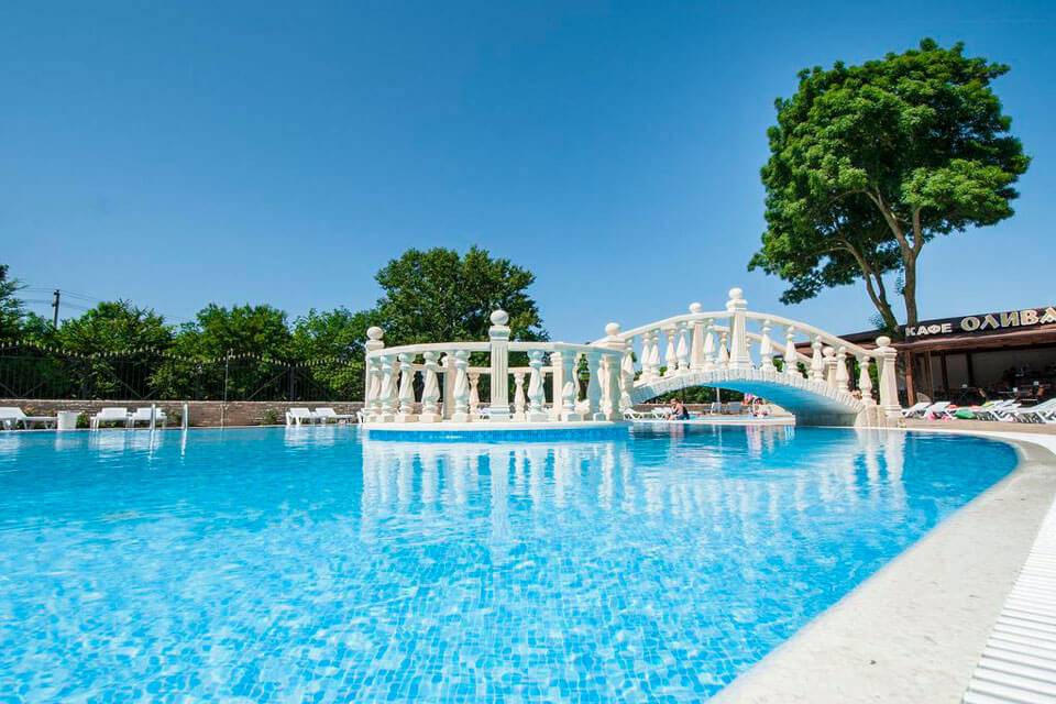 На территории есть два плавательных бассейна с пресной водой – взрослый площадью 200 квадратных метров, и детский с водной горкой с сплеш-аттракционом