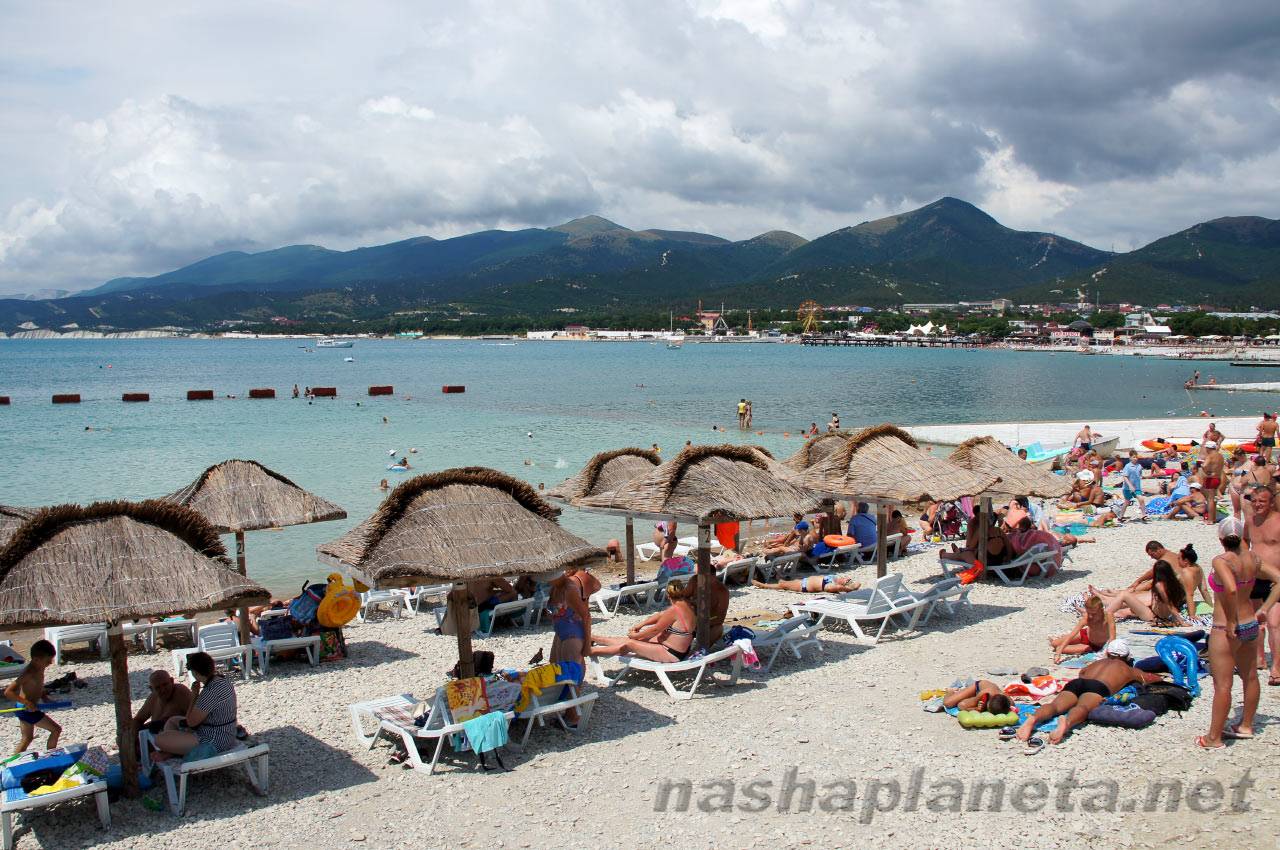 Почти все пляжи в Кабардинке галечные, есть совсем немного песчано-галечных с серым песком, и совсем нет чисто песчаных. Глубина везде довольно большая, но уклон дна равномерный без резких обрывов. Так что если вы любите отдыхать с детками на чистом желтом песочке и на мелководье, лучше отправиться в Анапу, например. Еще одна неприятность, которая тут поджидает – мелкие и крупные камни на дне. Они попадаются повсеместно, но особенно много их на диких и санаторных пляжа. Непосредственно на центральном пляже камней меньше, дно здесь чистят.