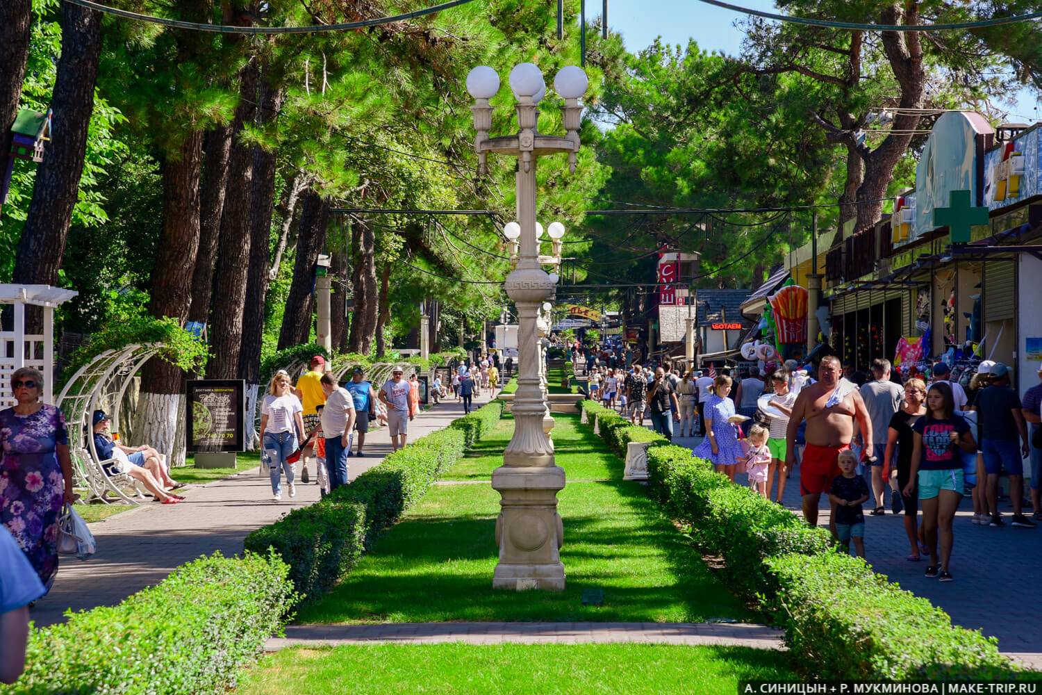 Кабардинка — небольшой поселок в тени Геленджика. Я считала, что он колхозный и полузаброшенный, как некоторые маленькие поселки на Черном море, но нет. Курорт оказался чистым и ухоженным, с длинной зеленой набережной и невероятным количеством развлечений для детей. К пляжам ведет длинная пешеходная аллея с фонарями, лавочками, сувенирными ларьками и кафешками.