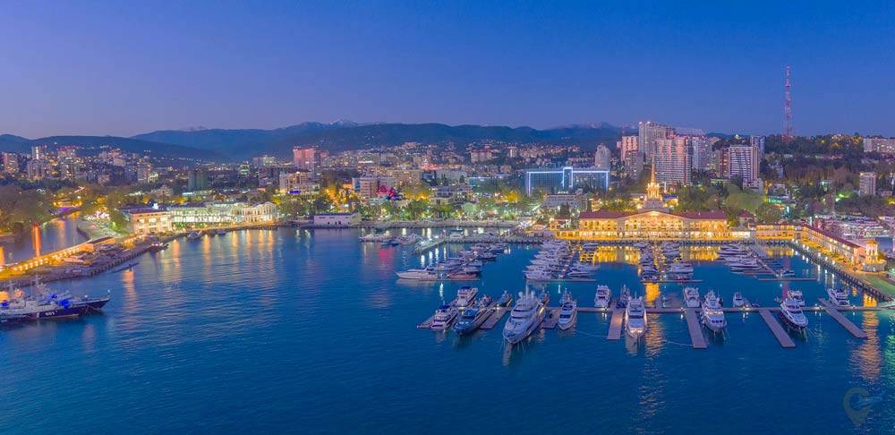 Сочи вечером, вид на вокзальный комплекс Морского порта