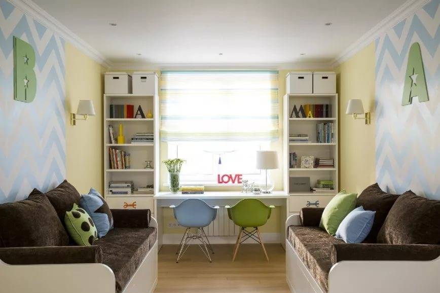 Если окно посередине, пространство до стены с двух сторон заполните зоной для хранения вещей во всю высоту. Она может быть симметрична с обеих сторон. Зонируйте помещение цветом, если дети разнополые.