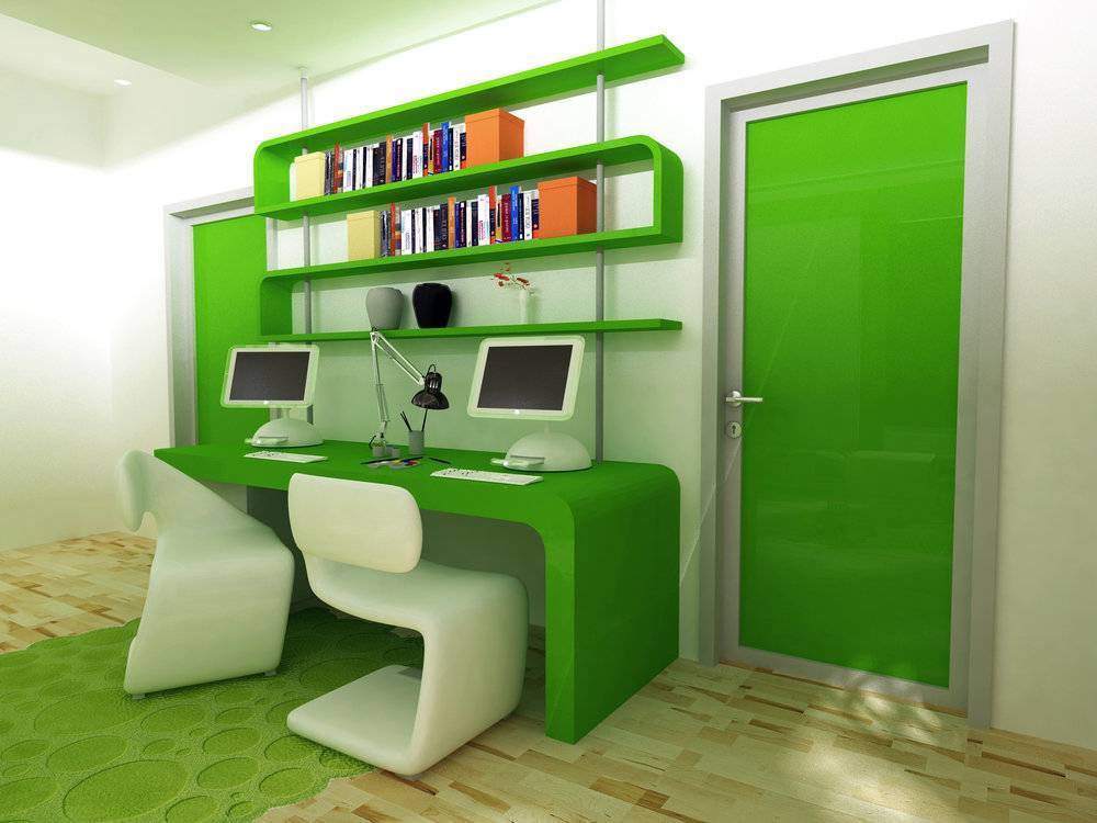 2. Частичный монтаж письменного стола к стене. Для вещей – модули с полками во всю высоту. Стол монтируется на стену. Для устойчивости – хромированные или деревянные ножки. Эргономичная треугольная форма стола от стены до стены потребует лишь одну ножку для устойчивости.