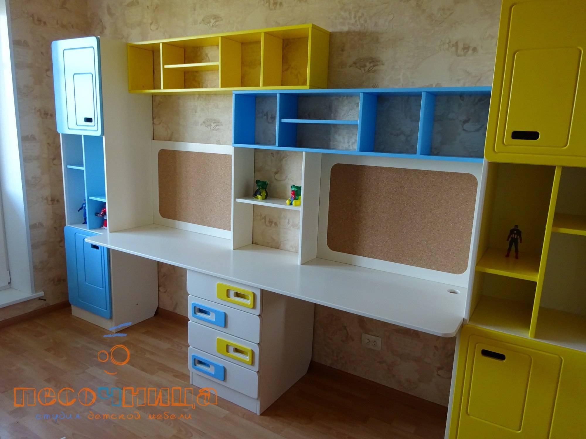Существуют и комбинированные варианты – продолжается вдоль одной из стен. Получается, что один ребенок занимается за угловым столом, а второй вдоль стены. Угловая часть стола лучше подойдет старшему, ведь там можно расположить и компьютер, и уединения в таком расположении больше.