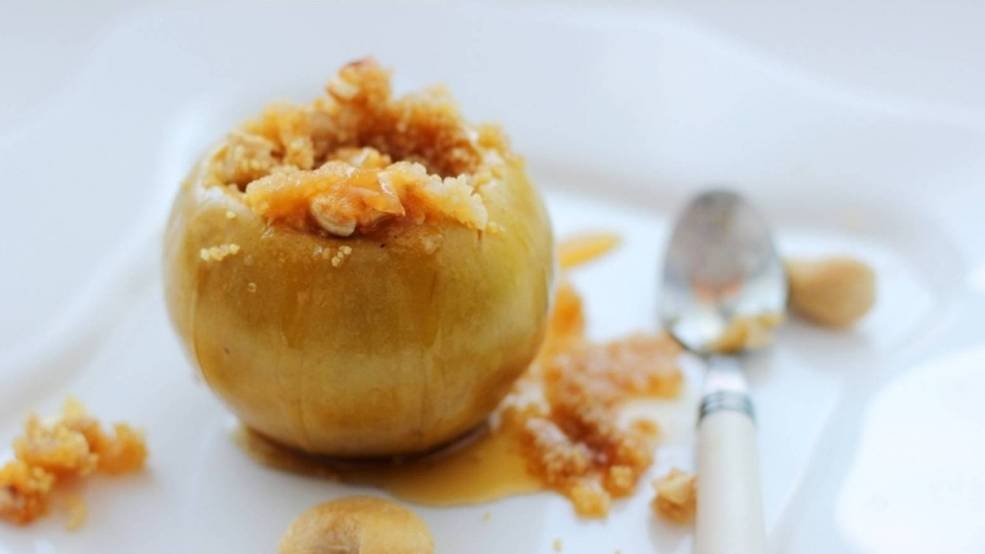 Яблоко вымыть, разрезать на половинки и удалить сердцевину. Запечь в духовке, добавив на дно формы немножко воды. Можно запечь яблоко в микроволновой печи (в закрытой посуде, иначе оно подсохнет сверху). В микроволновке яблоко приготовится гораздо быстрее — за 4 минуты. В духовке примерно за 14 минут.