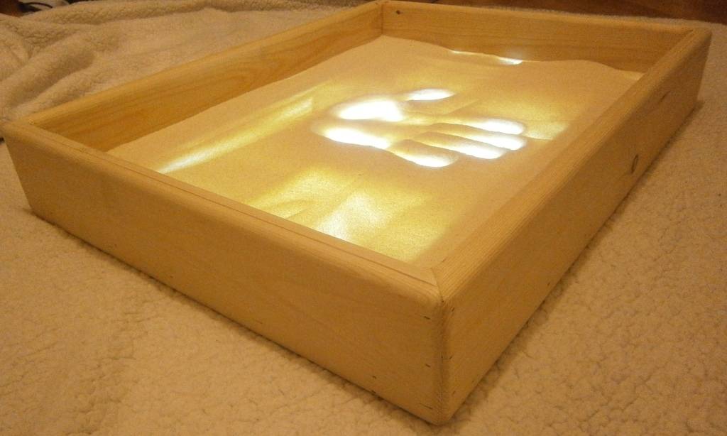 Опытным путем родители и взрослые творческие люди определили, какой высоты должен быть бортик по периметру, чтобы препятствовать просыпанию песка на пол, не мешая при этом процессу творения. Каким бы маленьким ни был ребенок, борта ниже 4 см окажутся непрактичными – придется регулярно убирать помещение и задуматься о периодических пополнениях запасов песка. Общепринятой нормой принято считать высоту бортов в пределах 5-6 см – это позволяет всю столешницу, вместе со светящейся панелью, ограничить толщиной около 10 см.