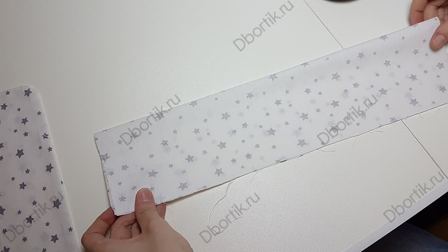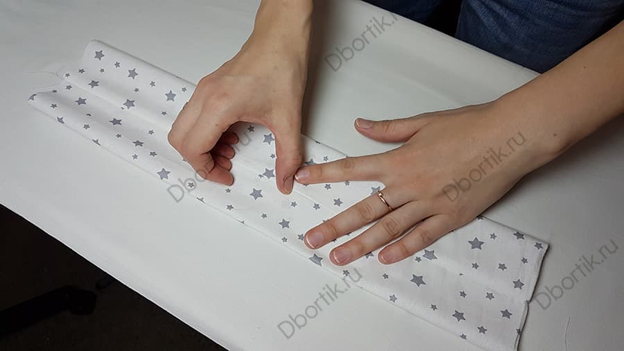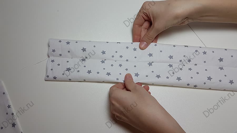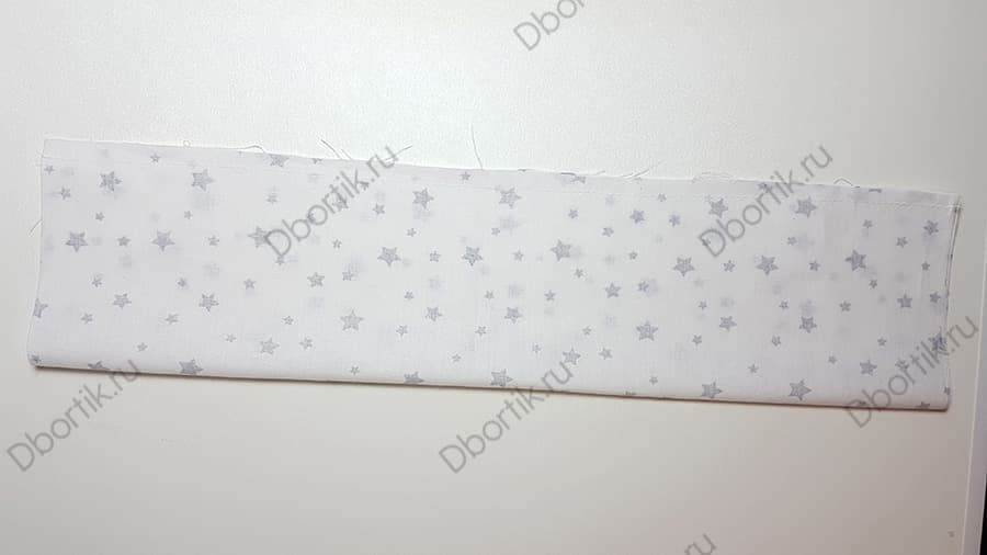 Второй конец подгибаем на 0,2 см во внутрь и еще раз на 1 см, как показано на фото и прошиваем на машинке по краю.