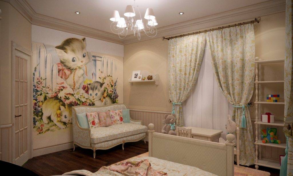 Прованс и винтажный стиль не предполагают делать акцент на шторах. Портьеры не должны затмевать элементы интерьера комнаты. Поэтому используются драпирующиеся лёгкие занавески пастельных оттенков длиной в пол. Уместным будет рисунок в виде небольших цветочков, но темнее основного фона на несколько тонов. В цвет узору оформляется окантовка занавесок рюшами. Для непослушного и гиперактивного ребёнка в возрасте 4–5 лет прованс подходит больше других стилей.