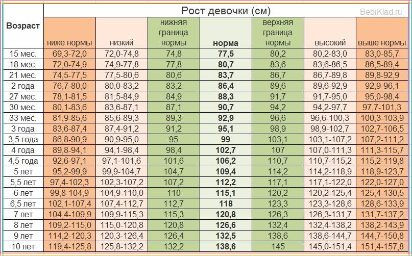 Таблицароста и веса для девочек от 1до 10 лет