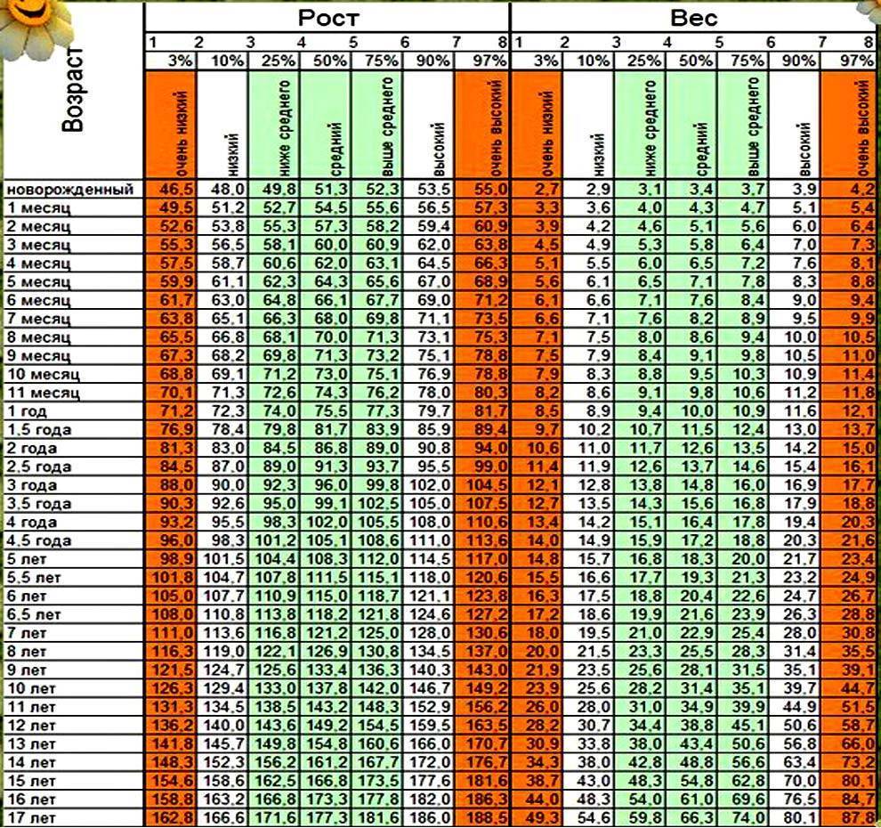 Мамы и папы детей от 0 до 17 лет с легкостью могут определить соответствие роста и веса собственных чад с помощью специальной таблицы. В верхней строчке расположены цифры от 1 до 8, которые обозначают своеобразную оценку показателей физического развития, а процентные величины уточняют отклонения от средних показателей