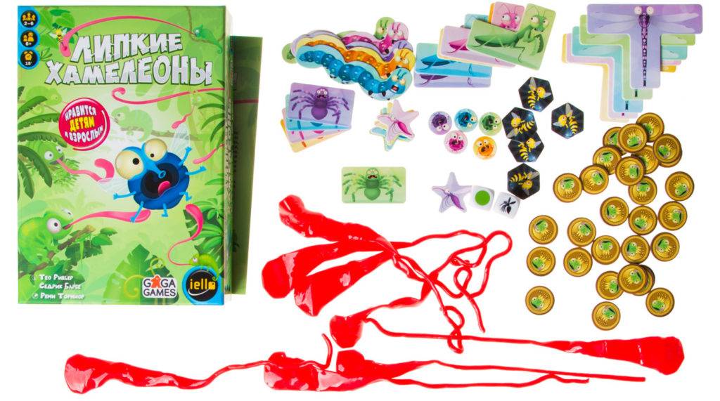 Если и существует игра, которая заставит детей смеяться как сумасшедших, а взрослых — как детей, то это Липкие Хамелеоны. Еще бы! Ведь это игра на скорость и внимательность, где у каждого игрока есть липкий лизун-язык, которым нужно хватать со стола картонных бабочек, стрекоз и других жужжалок.