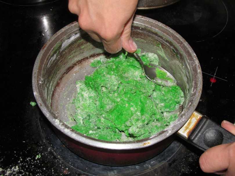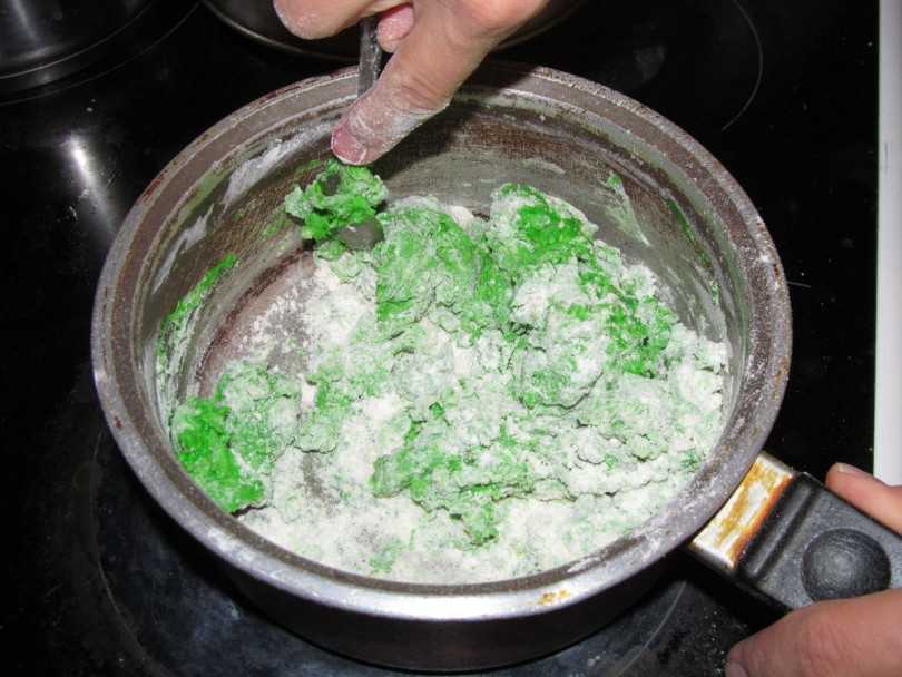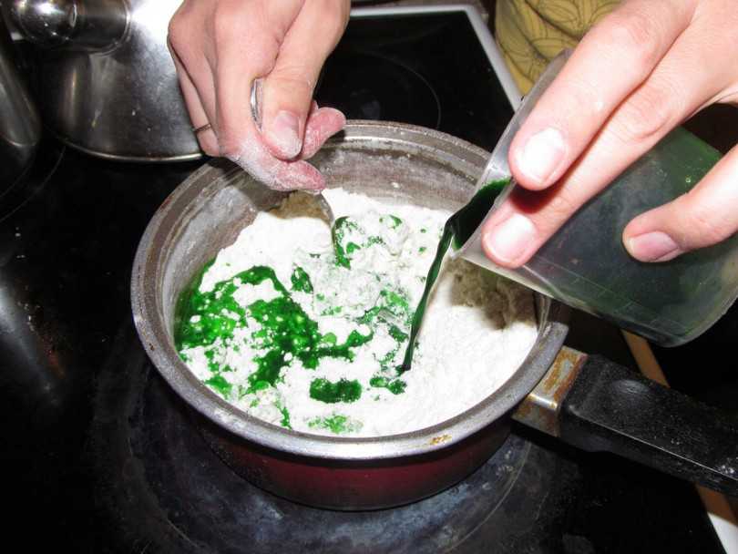 - Присоединить глицерин и порциями вводить воду. Вымешивать тесто ложкой.