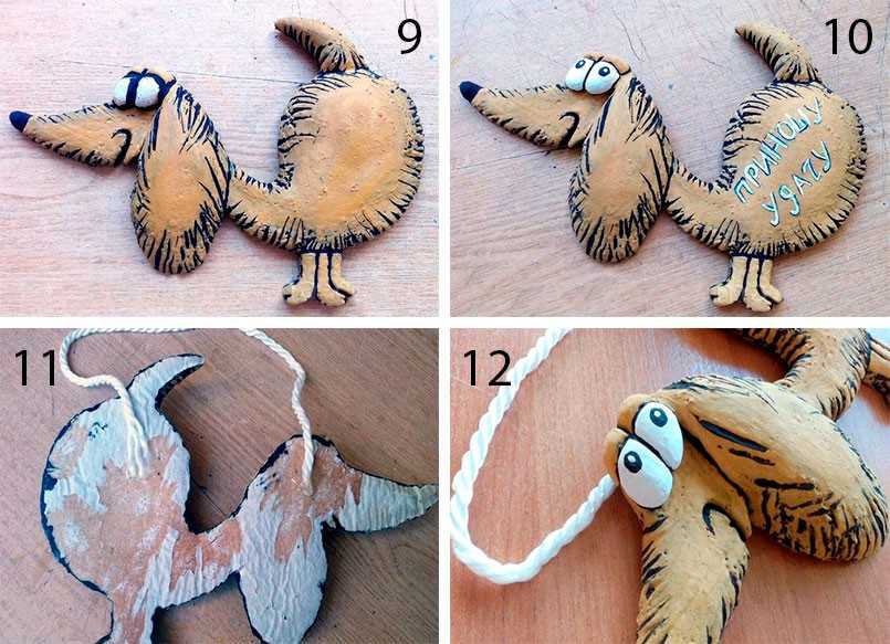 Сзади приклеить веревку, а саму поделку вскрыть прозрачным лаком. Изделие готово. Такая необычная и веселая собачка обязательно принесет удачу.