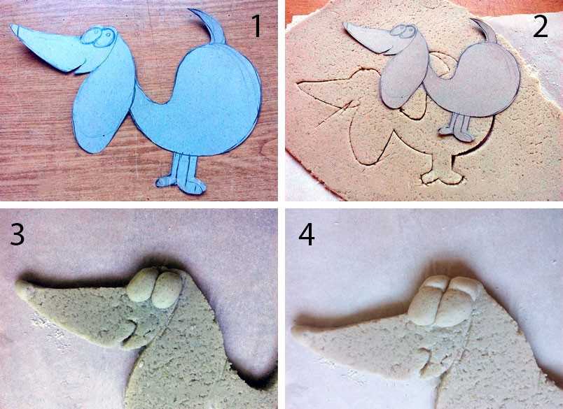 - Раскатать тесто. Должен получиться пласт толщиной приблизительно 5 мм. Приложить к нему картонную заготовку и вырезать фигуру по контуру. Обрезки теста отодвинуть в сторону.