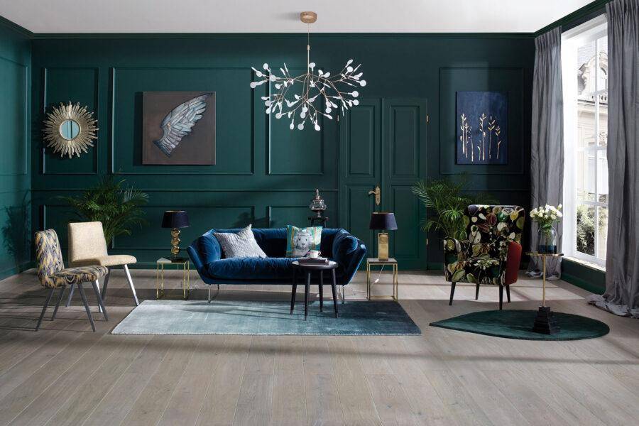 Для создания спокойного жилого пространства нужно подумать об использовании зеленого цвета на всех стенах. Роскошный тон драгоценных камней, такой как Jewel Beetle (русский жук Знахарь), придает комнате тепло и эффектность. В этом случае интерьер дополняется мебелью, окрашенной в насыщенные и глубокие, например в шоколадный или кофейный.